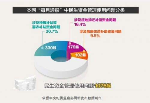 基层腐败问题点多面广,在涉及民生资金管理使用的问题中有三类问题较突出:涉及种粮补贴等惠农补贴资金问题330起、涉及征地拆迁补偿资金问题176起、涉及危房改造补助资金问题102起,分别占民生资金管理使用问题的30.7%、16.4%、9.5%。