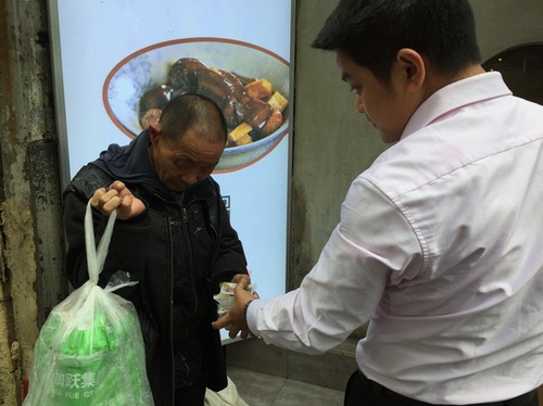 饭店老板从冰箱里拿出三个月饼塞给流浪老人 葛俊?。?/p>
