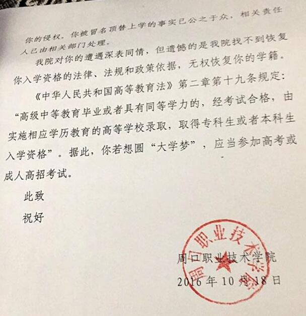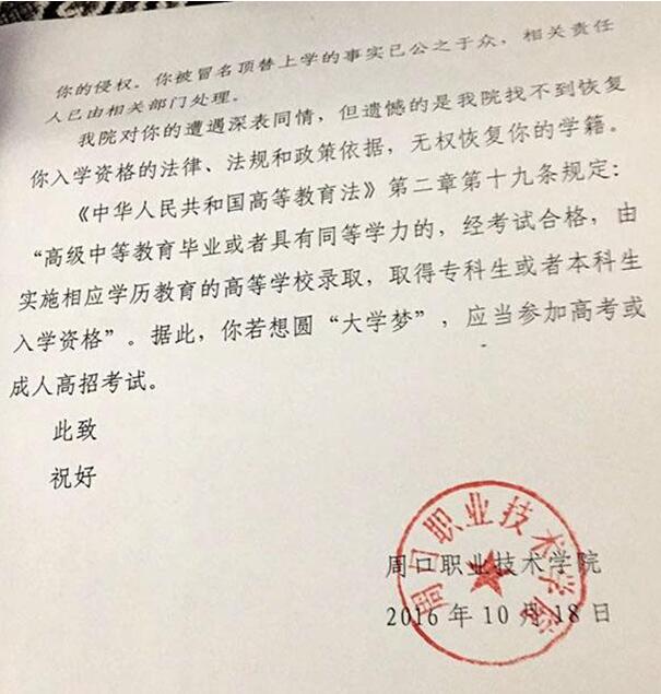 10月18日,周口职业技术学校出具回函称:“在2003年规定时间内,王娜娜已经持录取通知书到校报到,当年录取通知书已经完成使命……你被冒名顶替上学的事实已公之于众,相关责任人已有相关部门处理……找不到恢复你入学资格的法律、法规和政策依据,无权恢复你的学籍?!?/strong>