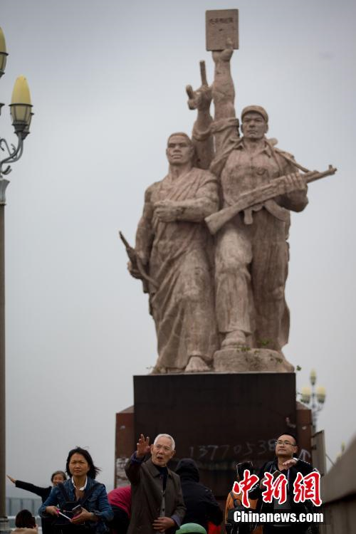 10月28日,民众在南京长江大桥南堡雕塑前留影。当日晚22点,南京长江大桥公路桥全封闭大修工程开启。据悉,整个工程初步预计将历时27个月,长江大桥封闭期间行人、非机动车和机动车均无法通行。1968年全面建成通车的南京长江大桥,是中国第一座自行设计、自行研制材料建造的特大型公铁两用桥梁,至今已“服役”48年。中新社记者 泱波 摄