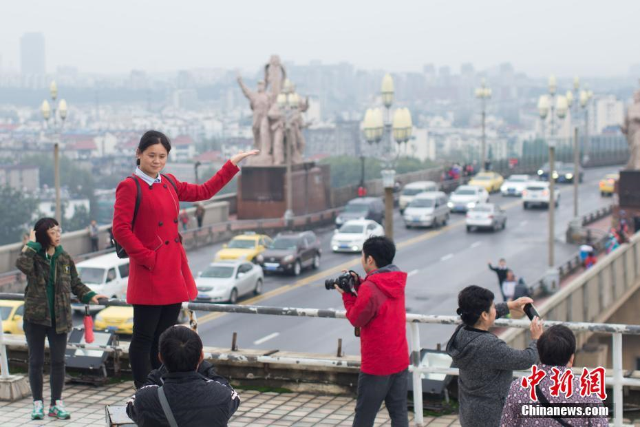 10月28日,民众以南京长江大桥南堡雕塑为背景留影。当日晚22点,南京长江大桥公路桥全封闭大修工程开启。据悉,整个工程初步预计将历时27个月,长江大桥封闭期间行人、非机动车和机动车均无法通行。1968年全面建成通车的南京长江大桥,是中国第一座自行设计、自行研制材料建造的特大型公铁两用桥梁,至今已“服役”48年。中新社记者 泱波 摄