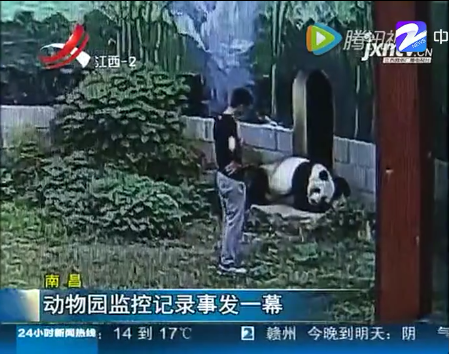 10月27日16点,一名青年男子擅自翻越围栏进入南昌市动物园大熊猫馆外运动场,挑逗正在休憩中的大熊猫,随即被大熊猫抱住按倒。随后该男子侥幸挣脱,并攀爬逃离现场。网友对此谴责,称这是作死的节奏。