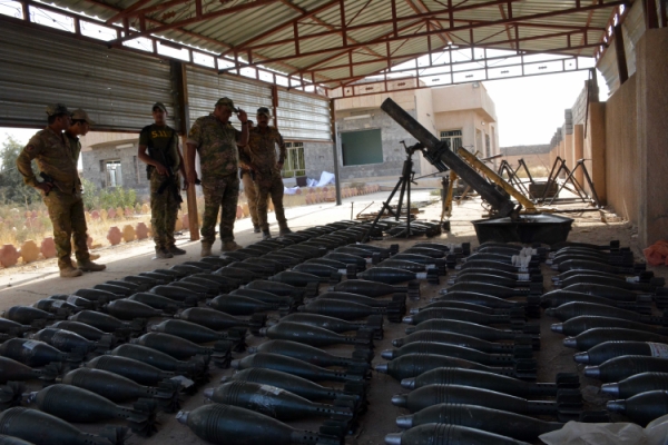 10月30日,伊拉克政府军军官在舒拉镇检查从“伊斯兰国”武装分子处缴获的武器。