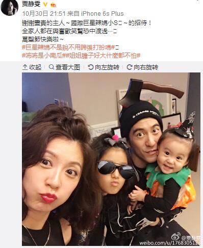 贾静雯爱女变身“最萌南瓜” 一家五口搞怪合影