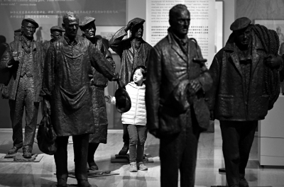 一个小女孩在司徒安创作的劳动群像系列雕塑作品前驻足观看。记者 饶强摄