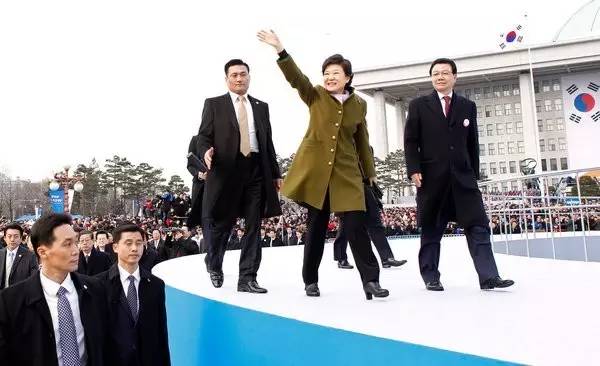 ?2013年2月,2月份,成为韩国首任女总统的朴槿惠在首尔的就职典礼之后,向人群挥手致意。