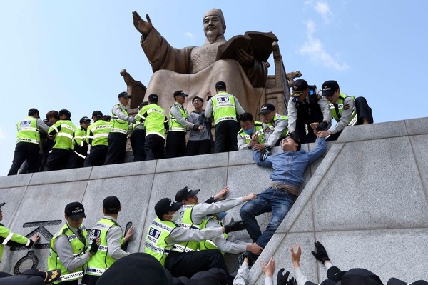 ?韩国“岁月号”海难后,八名大学生在首尔市中心,爬上了韩国古代国王的标志性雕像,并展开一面条幅,上面写着“朴槿惠政权下台!”