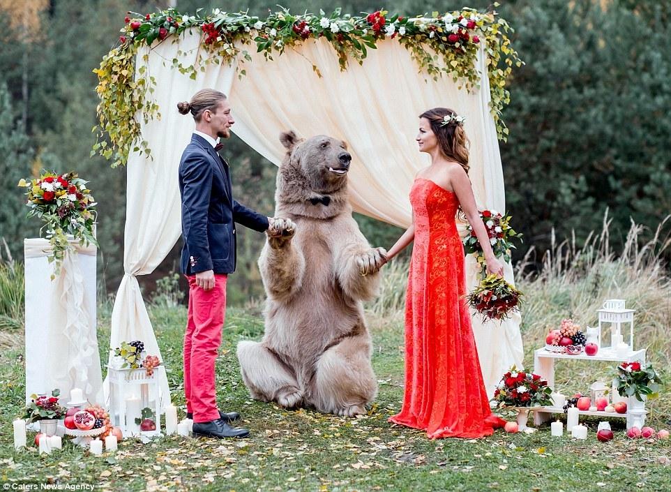 据《每日邮报》报道,近日,一对俄罗斯情侣丹尼斯(Denis)和尼利亚(Nelya)在莫斯科举行了婚礼。与众不同的是,他们邀请了一只重21英石(约267斤)的灰熊上台,作为特别嘉宾为证婚,甚至还吻了新娘。