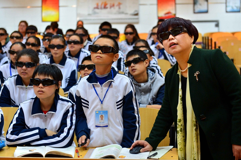 信息化已成为本世纪最鲜明的时代特征。云计算、移动互联网、虚拟现实、大数据等技术平台使“教”与“学”突破了时空限制,变革了教学模式,更多的学生开始接触、利用“信息化”,作为老师自然不能与之远离。同样的,作为培养教师的师范院校,又怎能不利用信息化带来的新机遇?图为山东省威海市皇冠中学的师生戴着3D眼镜上生物课。
