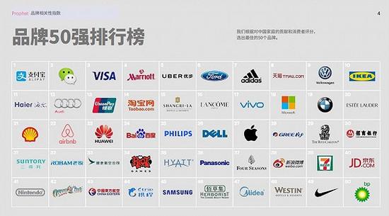 在中国,排名前三位的分别是支付宝、微信和VISA。接下来跻身前十位的还有万豪、优步、福特、阿迪达斯、天猫、大众和宜家。