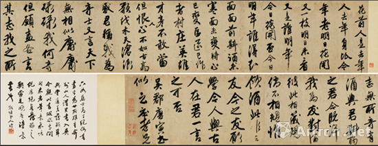 该书法长卷上所书“逃禅仙吏”印,是唐伯虎从南昌宁王处脱身回家后所刻,经历这一生死逃亡,他进一步看透世事,思想更加消沉,行为也更加颓废,全部心思都用在艺术创作上,这一时期的书法反而变得更加率意自如。此卷共33行178字,洋洋洒洒,一气呵成,三首诗连缀下来,连分割都不顾及?!跋卤嗜绶?,不假思索,接连出现了错字、重字、漏字和改字?!币布浞咸撇⒖癜恋男愿瘛?/p>
