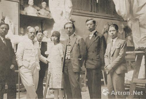 刘海粟一行拜访巴黎美院教授、雕塑家朗特斯基工作室,左二为朗特斯基,右起四人依次为刘抗、傅雷、刘海粟、张韵士。
