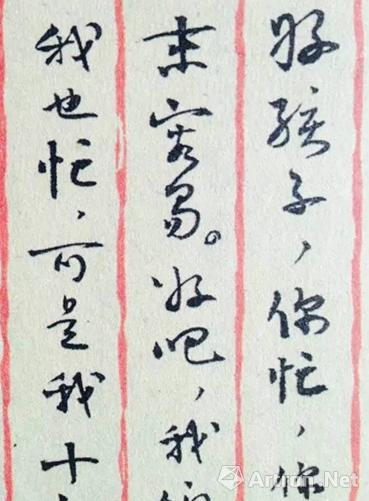 这种灵动在其后的家书中愈见明显,也愈加进入傅雷书法的成熟时期,傅雷此时以一个父亲深沉的大爱,与儿子谈艺术谈人生,絮絮叨叨,初读甚至让局外人不甚其烦,然而真正读进去,与致黄宾虹札一样,其间正有着一种微言大义处,甚或极多见道之言,且深入浅出,从这一角度也可以理解《傅雷家书》出版35年来慰藉人心、极受欢迎的原因所在。