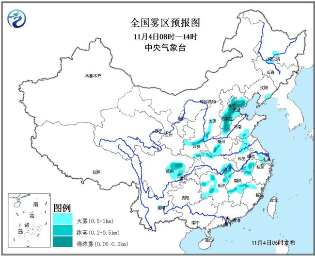 另外,4~5日凌晨至上午,华北中南部、黄淮大部、江汉东部、陕西关中、四川盆地等地的部分地区有大雾,其中华北中南部局地将有能见度不足50米的特强浓雾。中央气象台11月4日06时发布大雾橙色预警。