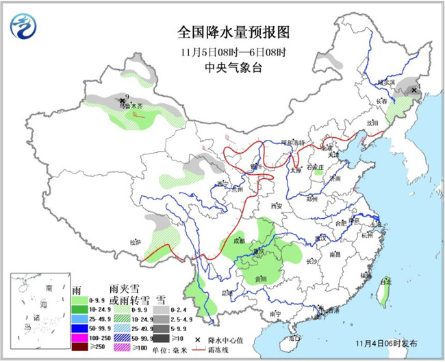 5日08时至6日08时,新疆北部、青海中部、内蒙古东北部、东北地区东部等地的部分地区有小到中雪或雨夹雪,其中新疆天山地区局地有大雪;四川东部、云南西部、贵州、重庆、湖北西南部、湖南西北部、台湾等地有小雨或阵雨。新疆中部、内蒙古西部、甘肃中部等地局地有4~6级风。