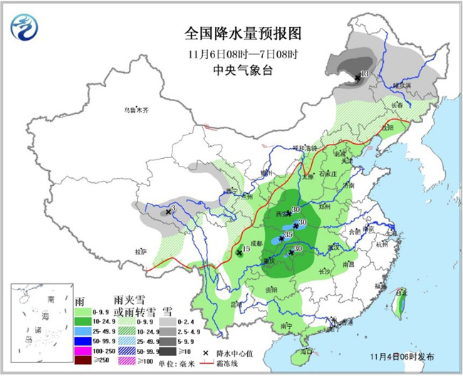 6日08时至7日08时,青海东部、甘肃中南部、内蒙古东部、华北北部、东北地区大部等地有小到中雪或雨夹雪,其中,内蒙古东北部局地有大到暴雪;西北地区东南部、西南地区东部和南部、江汉、江南西北部、江淮西部、黄淮西部、华北中南部、华南西部、台湾等地有小到中雨,其中,四川盆地东部、陕西南部、湖北西部等地的局部地区有大雨。