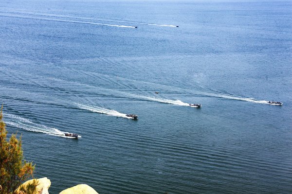 扫残破障队和两栖装甲车泛水编波对岸上目标实施打击、特种破袭队水下隐蔽渗透、直升机搭乘垂直突击队向目标地域接近……18日上午,中俄“海上联合—2016”军事演习联合立体夺控岛礁科目拉开战幕。 (摄影:尚文斌 严家罗 周紫春)