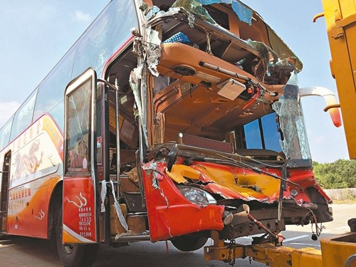 台游览车不慎追撞前车致车头全毁 32人受伤送医