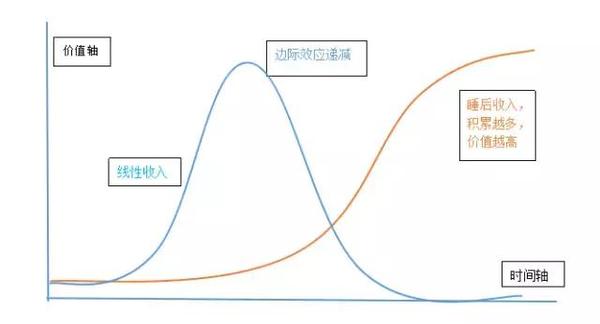其实,获得收入有两种模式,第一种是线性模式,出卖时间换得收入,多劳多得,关注的是单位时间的价值;第二种是指数型模式,赚取时间红利,时间越长获得收入越高,有人称之为“睡后收入”,通俗来讲,就是躺着也能挣钱,它关注的是时间长度。