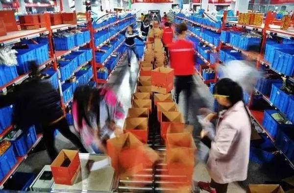 ▲ 2015年双11,一家电商在某地分仓库的打包发货场景。