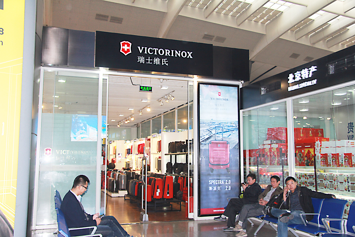 乘客坐在名牌箱包店外而店内空无一人