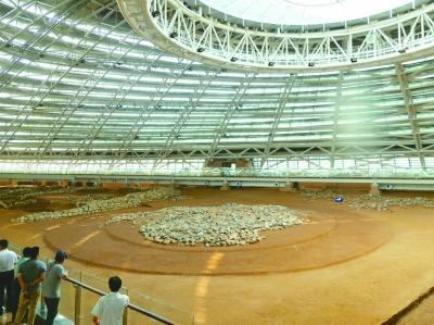 以往裸露在荒郊野岭上的祭坛和积石冢,如今已被一座面积7200平方米的建筑所罩住。本报记者 毕玉才摄光明图片
