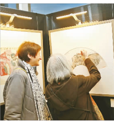 图为观众在欣赏中国画扇面作品展作品。刘军摄 光明图片