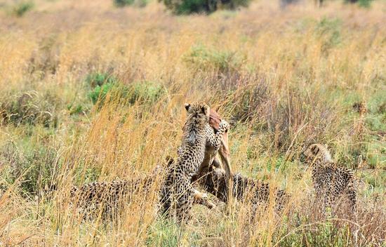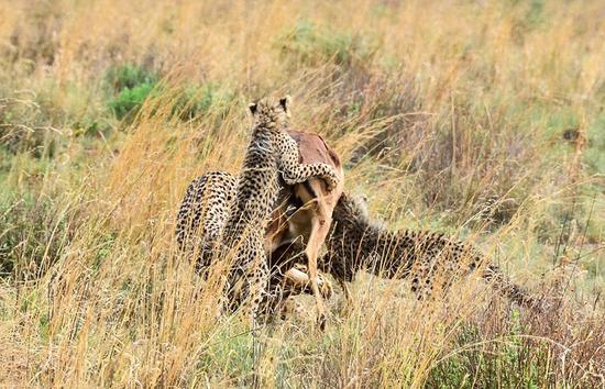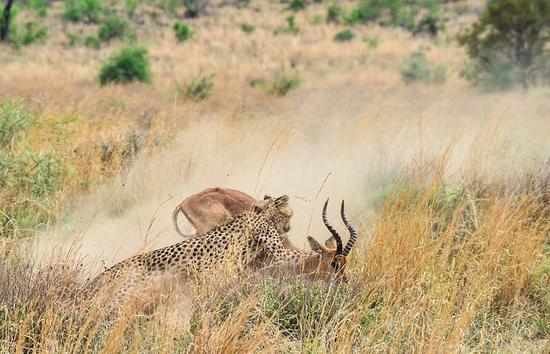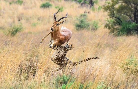 野外向导格雷格?艾斯特哈吉森(Greg Esterhuysen)在南非匹兰斯堡国家公园(Pilanesberg National Park)用相机抓拍到戏剧性的一幕:一只猎豹瞄准一只黑斑羚后,急速冲刺过去。它扑到黑斑羚背上,将其拖倒在地,为幼崽捕获了一顿丰盛的晚餐。