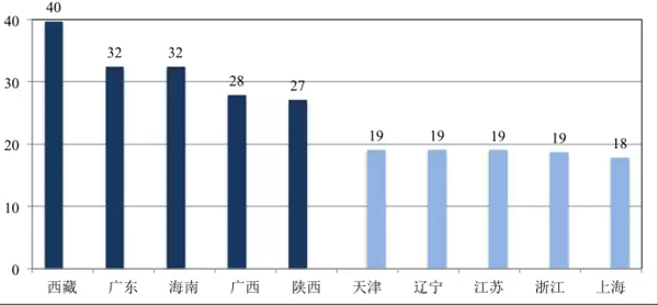 图4:中国农村地区15岁及以上男性未婚比例最高、最低的五个省(单位:%)