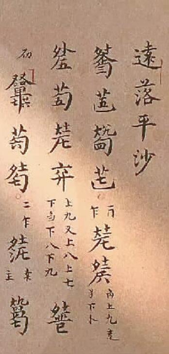 “琴谱最早是用文字记录的,就是用纯文字描述哪个手指,在什么位置,用怎样的动作,弹拨哪一条弦。但是这种文字谱过于繁复,也就是古人说的‘动越两行,未成一句’。随着古琴演奏艺术的发展,必然要求记谱方式走向简化?!闭抛邮⒔樯埽踝制准坛辛宋淖制椎乃嘉旒?,将文字谱所记录的徽位、弦数、右手指法、左手指法四项主要内容分别用简单的汉字或部分偏旁来表示,再将这些符号进行组合,形成新的方块字,这就是“减字”。