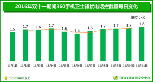 中新网11月15日电 双十一网购节,既是广大消费者的购物狂欢节,也是犯罪分子们趁机行骗的绝佳时机。今天,360互联网安全中心综合2016年的双十一各项大数据,发布了《2016年双十一中国网购安全专题报告》(以下简称报告)。报告显示,2016年双十一期间(11月1日-11日)360手机卫士平均每天拦截的骚扰电话多达1.6亿次,并且在11月11日当天,360手机卫士拦截的骚扰电话达到巅峰值1.8亿次,同时刷新了年内最高纪录和历史最高纪录。
