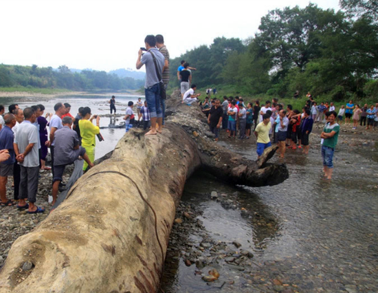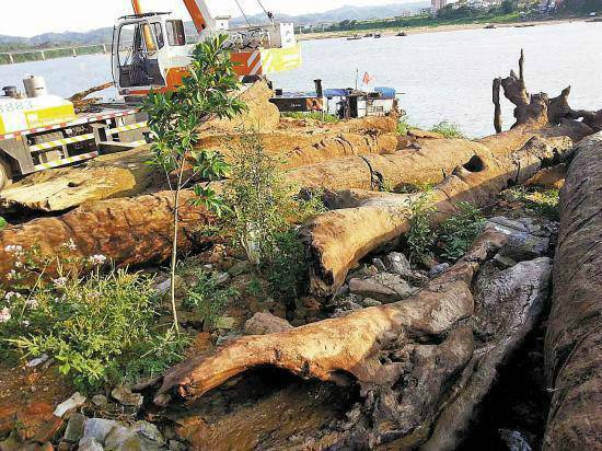 2013年9月4日,江西修水县农民梁财在河道里发现一根长达24米、直径1.5米、重80吨的疑似乌木。
