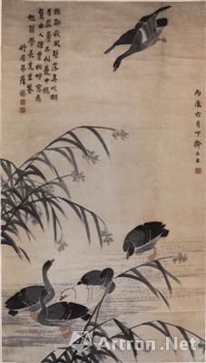 这幅《芦雁图》轴,纵120厘米,横92厘米,纸本,设色水墨画。上写河滩之上,水低沙平,芦花飘雪。芦苇沼泽上的五只芦雁,或曲颈理羽,或俯首觅食,或缩首酣睡,或俯仰唼咂,或引颈远望。此时,滩头上空有一只高声啼叫的芦雁,已双足伸出,即将落地。顿时,芦苇沼泽上的芦雁纷纷秋风振翮,弄吭明月,使寂静的河滩雁声嘹亮,划破夜空,突现生机。这正是“画雁分别见雁鸣,缣湘飒飒荻芦声,笔头何限秋风冷,尽是关山离别情。”此图虽只写芦雁六只,但宿鸣飞食,各尽形态,无一雷同,而又无一不真,充分说明了作者对芦雁的习性了如指掌,观察细微。故所写芦雁,得心应手,神采奕奕,达到了出神入化的效果。