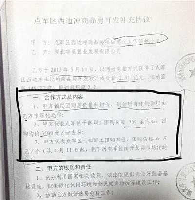伍安军曾在公开场合出示的材料显示,双方“经过多次协商,初步达成点军区干部职工以每平方米3500元的价格购买950套团购房,剩余房屋按市场价出售的意见?!?/p>
