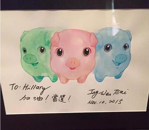 当晚募款晚会的高潮,就是李应元将一幅蔡英文亲笔签名的“三只小猪”的画像,透过阿肯色州前州长毕比(Mike Beebe)转送给希拉里,两人并在镜头前与小猪画像合影留念。