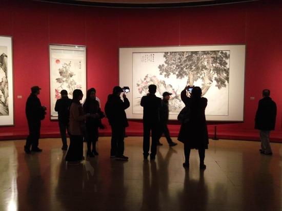 中国美术馆以三个展厅展出精选而出的陈半丁先生在花卉、翎毛、人物、山水、书法、篆刻等多艺术门类的代表作。被称为“中国美术第一墙”的圆厅弧形墙悬挂着陈半丁先生《百花齐放》等巨幅中国画作品,展示出其作为20世纪中期北京画坛的领军人物雄心与气概。两侧展厅呈现陈半丁先生94年人生铸就的艺术精品,经典唯美,大批观众驻足留影,欣赏赞叹之声不绝于耳。