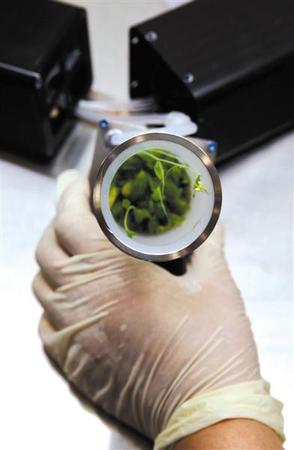 11月18日,科研人员展示从太空返回并开花的拟南芥。新华社发