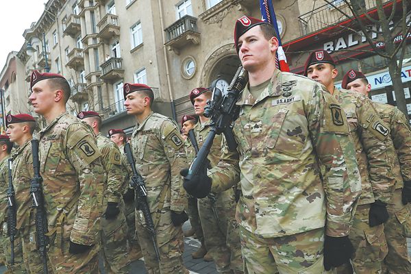 23日,美军士兵在立陶宛首都维尔纽斯参加北约“铁剑2016”军事演习的阅兵式。