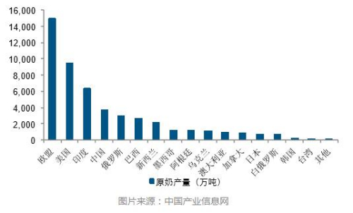 全球原奶五大主产区包括欧盟、美国、印度、中国、俄罗斯,2015年原奶产量合计为3.76亿吨,占全 球原奶总产量的75%。 欧盟、美国、印度、中国、俄罗斯原奶产量分别为14960、9462、6400、3755、3055万吨,占比分 别为30%、19%、13%、8%、6%。