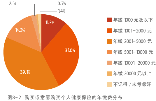 对于已经购买或考虑购买个人健康保险保费的职工来说,选择年缴费在2001-5000元之间的职工比例最高,为39.1%,其次是年缴费在1001-2000元之间,比例为31.0%,而年缴费不超过1000元的职工比例为11.3%,也就是说,超过8成的职工会选择年缴费在5000元及以下。报告分析指出,这种分布在各类人群中较为稳定,也就是不论年龄、收入、职级、所属行业等差异,选择年缴费在2001-5000元之间的职工比例基本上都是最高。