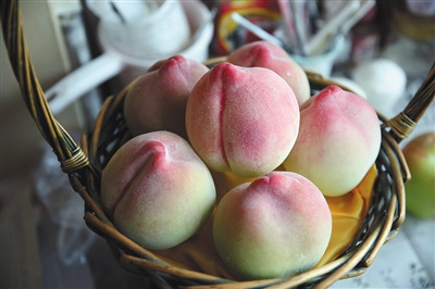 西城区刘秀华的家中,刘秀华制作的蜡果水蜜桃。记者 李飞