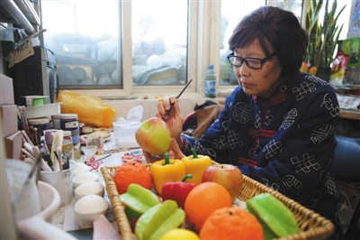 昨日,西城区非物质文化遗产蜡果制作传承人刘秀华的家中,刘秀华正在制作水果蔬菜。