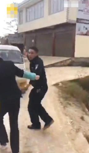 记者注意到,这段视频并不完整。在播放41秒后,场景突然跳跃至另一画面,一男子揪住该警察的衣领,将其推至墙角。这时,有一女子悄悄溜到警察身后,疑似抢枪,警察则一直将枪藏到自己身后。这时,人群中有人大喊:“不要抢,抢不得!”视频显示,一阵拉扯过后,人们将警察围住?!拔颐淮?开枪打人),你们的(锄头)一直对着我。”该警察说道。