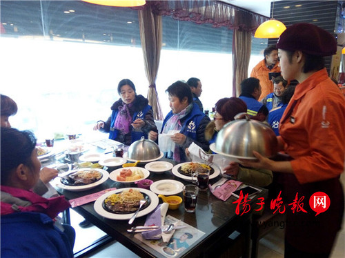 扬子晚报网11月25日讯(通讯员 施澎 戴勇 记者 万凌云) 时近年末天寒地冻,然而社会各界人士关爱环卫工人的热情却一波波来袭。25日中午,在镇江市区梦溪路一餐厅内,镇江50名环卫工人齐聚一堂,“尝鲜”吃牛排。这次温暖、关爱环卫工公益活动,是由镇江公益组织“家家乐助残助老服务中心”和这家餐厅联合发起的。而与以往社会给环卫工人发“爱心福利”的方式不同,这次前来就餐的环卫工中,大多数都由爱心人士走到作业地段上,现场邀请召集而来的。由此,面对天上掉下来的“牛排”,邀请人还被当成了“骗子”。