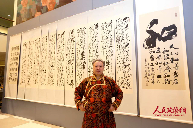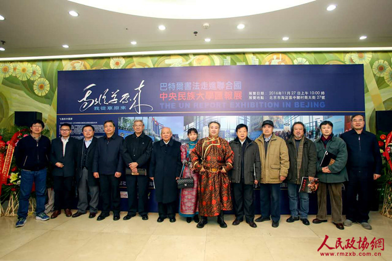 人民政协网北京11月28日电 从联合国载誉归来的蒙古族书法家“苏伦·巴特尔书法走进联合国民大汇报展”于11月27日在北京中央民族大学举行。来自五湖四海的文化界、艺术界、商界、金融界的精英以及社会各界热爱书法艺术的人士济济一堂,中央民族大学党委副书记刀波为汇报展致辞。