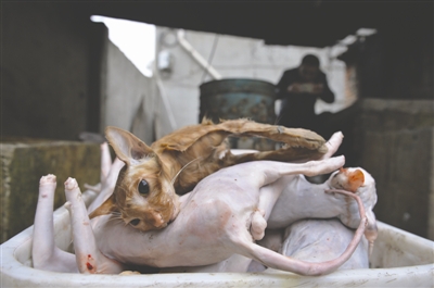 黄平富说,这些“新鲜的肉”并非兔肉,而是猫肉。成都商报记者看到,麻袋里的猫已全部去皮、去内脏。记者称需要大量的新鲜货源,询问黄平富一天能杀多少只猫,黄平富爽快地回答:“100多根(只)嘛,把头去掉,再剁成块,个头跟兔子差不多,没人能分出来。”