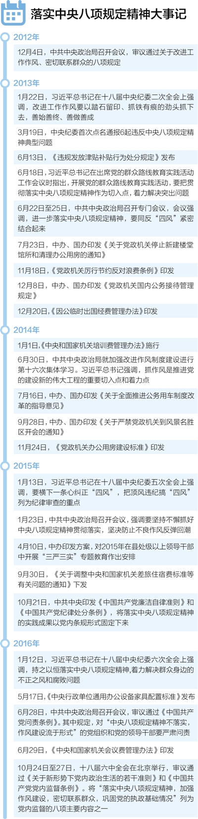 十八届六中全会通过了两个重要党内法规——《关于新形势下党内政治生活的若干准则》和《中国共产党党内监督条例》,其中都多次提及“八项规定”。
