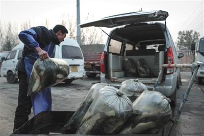 11月26日,北京新发地批发市场,鱼贩们把刚批发来的活鱼运进面包车。 新京报记者 彭子洋 摄