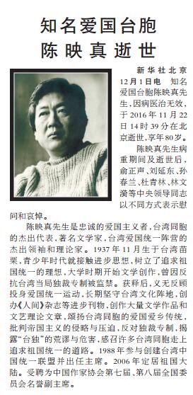 人民网北京12月2日电 12月2日出版的《人民日报》在第四版配图转发新华社文章——《知名爱国台胞陈映真逝世》。知名爱国台胞陈映真先生,因病医治无效,于2016年11月22日14时39分在北京逝世,享年80岁。