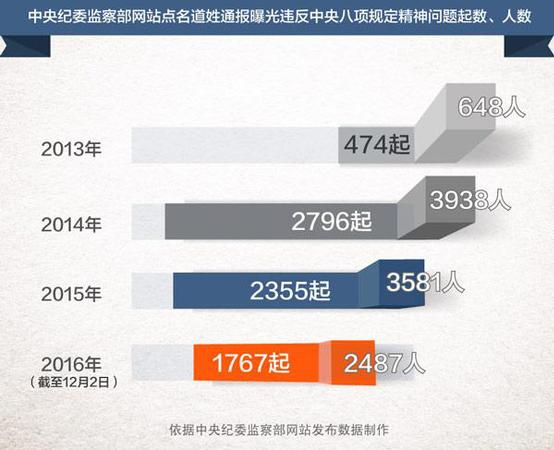 截至2016年12月2日,四年间,中央纪委监察部网站“违反中央八项规定精神问题监督举报曝光专区”已持续通报各类“四风”问题7392起,10654人被点名道姓公开曝光,日均通报曝光7.3人。